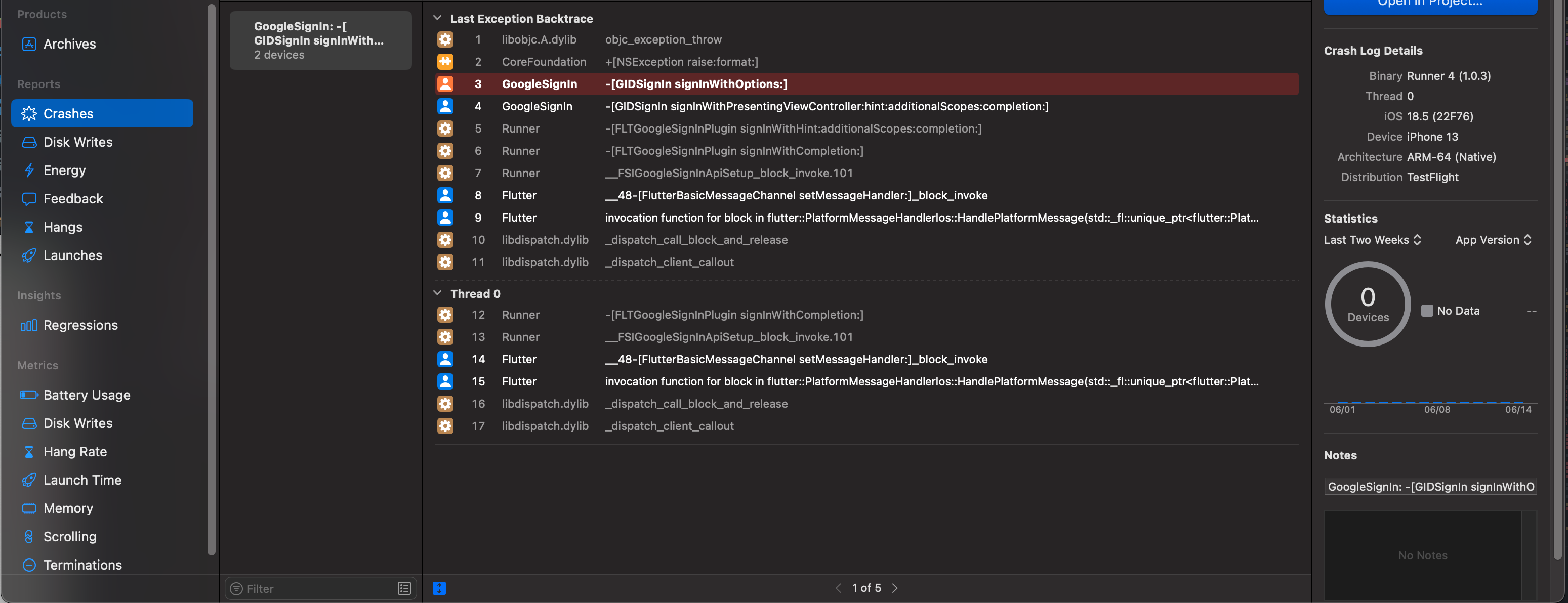 앱스토어 또는 testflight에 배포한 앱이 강제종료(Crush)되었을 때 로그 확인할수 있다.