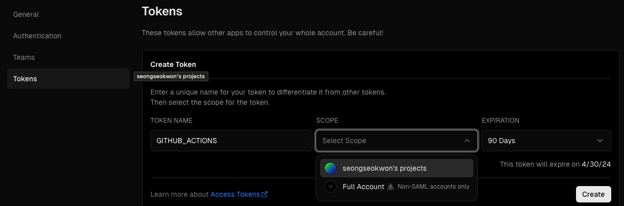 - VERCEL TOKEN을 생성하도록 하겠습니다.